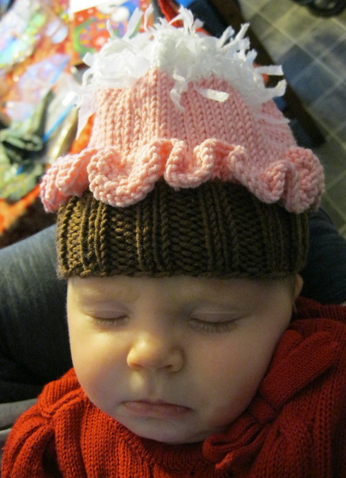 Pattern: Sweet City Cupcake Hat by Lori Sands Same hat as #50, a size larger. I used the same yarn (color was more accurate in the previous picture) – but I topped it with “coconut” this time. This is my beautiful niece Kylee!