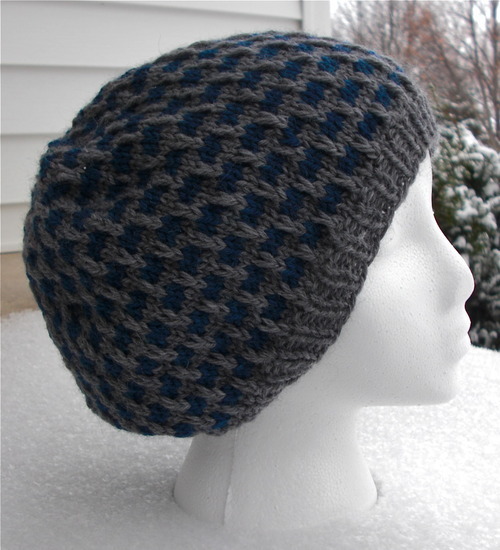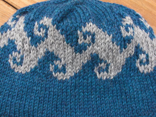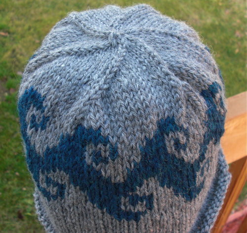 Pattern: Swell by Kimmie Kemper, Knitty.com Yarn: Cascade 220 Heathers, mallard and grey This is the companion hat to #9. (See both together.) I made a mistake, though… I knit the wave motif upside down.